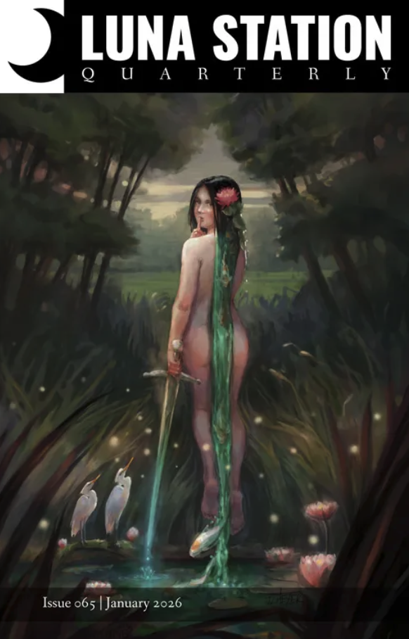 Image of a naked woman with long hair down her back holding a sword, floating above a lake